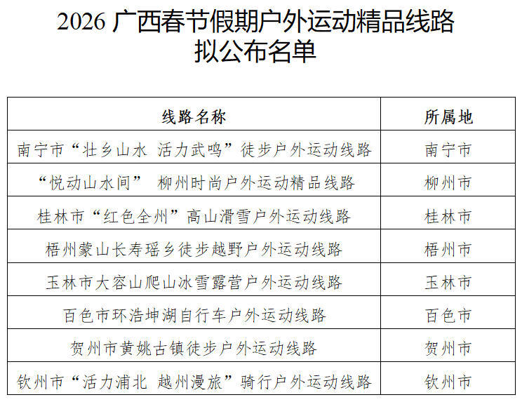 经各相关单位推荐,市级初审,自治区体育局评定等相关程序,拟公布8条2026广西春节假期户外运动精品线路(详见附件)。现予以公示,公示期为2026年1月15日—2026年1月19日。