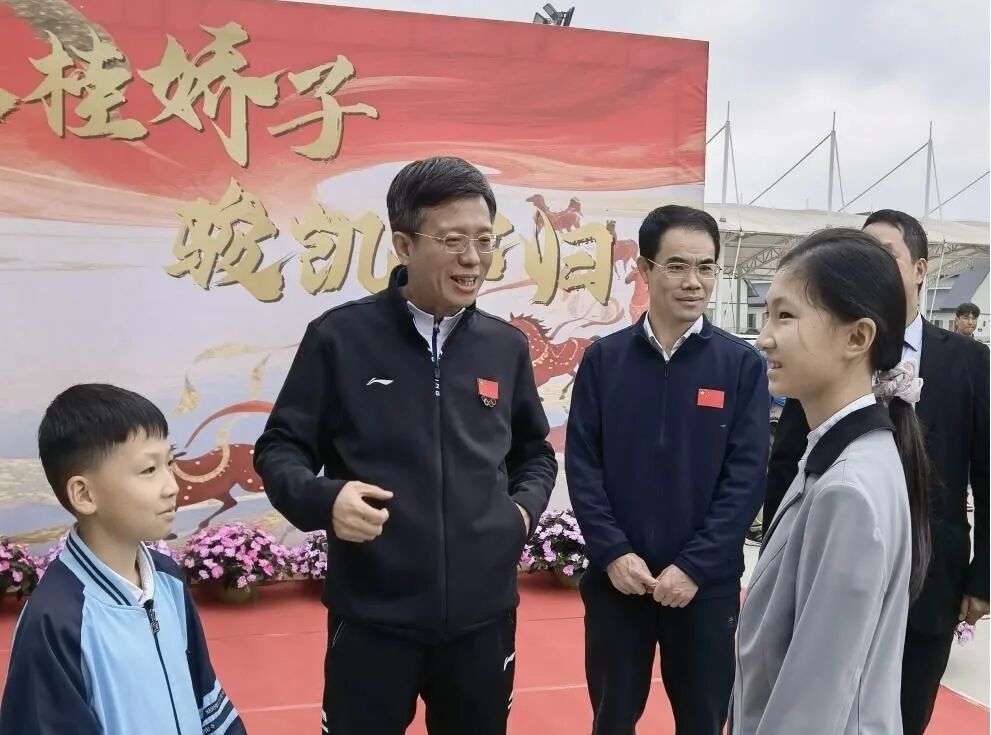 当天,上林县马术中央公园还有不少喜欢马术运动的青少年慕名而来,热烈欢迎冠军队伍凯旋。“你们在哪儿上学?喜欢骑马吗?练习马术多久了?”黄剑峰与在场观摩训练的青少年运动员进行了亲切交流,详细了解他们的学习、训练情况,了解他们参与马术运动的体验与感受。黄剑峰表示,开展马术运动训练不仅可以锻炼身体,更培养了青少年的勇气、耐心和责任心。他鼓励孩子们保持对马术运动的热爱,坚守体育梦想,享受运动乐趣,争做德智体美劳全面发展的新时代好少年。