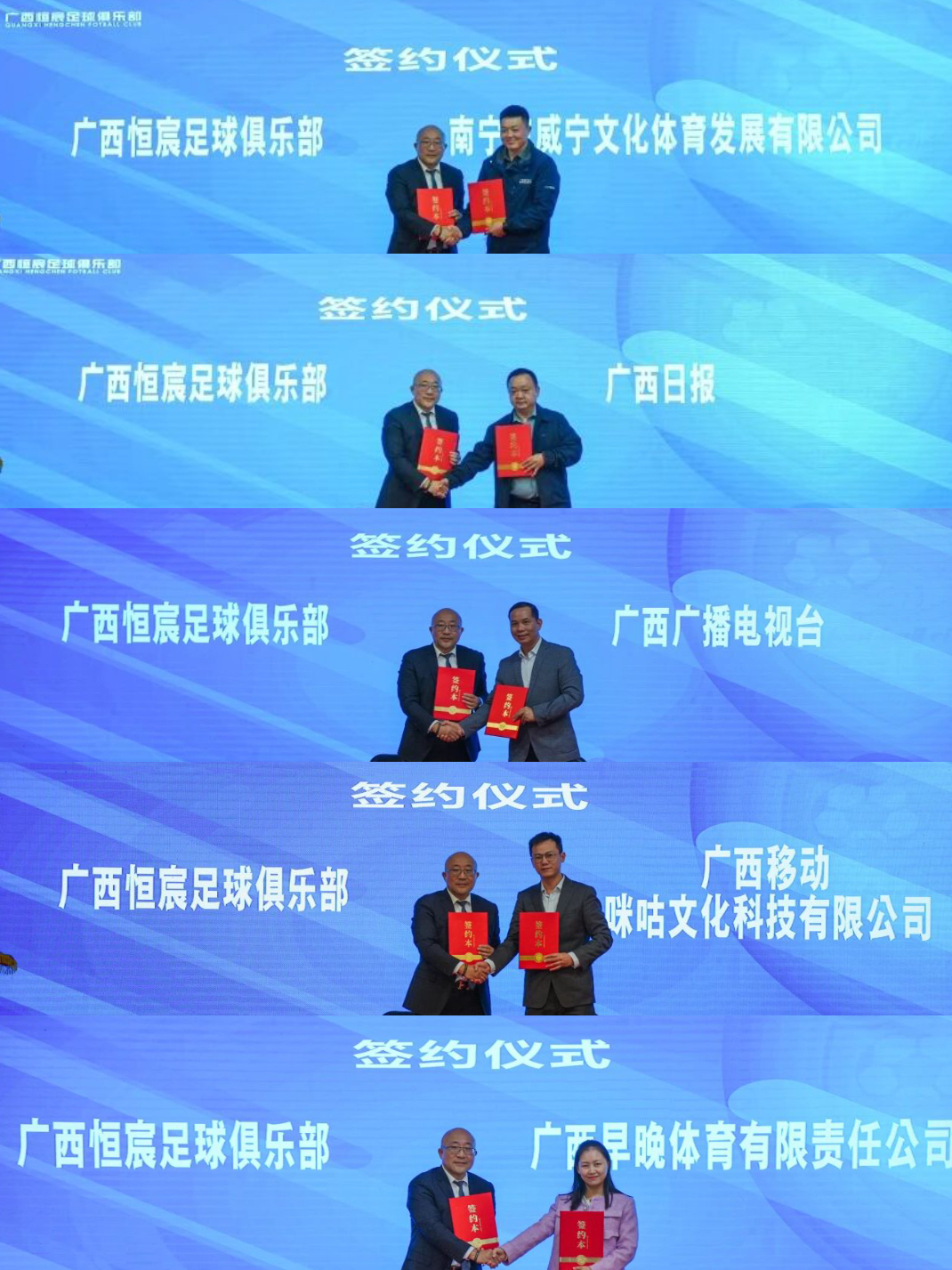 招商大会现场,南宁威宁文化体育发展有限公司、广西广播电视台、广西日报、广西移动及咪咕文化科技有限公司、广西早晚体育有限责任公司等五家企业与广西恒宸足球俱乐部正式签约,确立2026赛季合作伙伴关系。随后广西日报、广西广播电视台、南宁威宁文化体育发展有限公司、广西移动及咪咕文化科技有限公司等四家企业代表分别就2026赛季与广西恒宸俱乐部的合作进行专项推介。