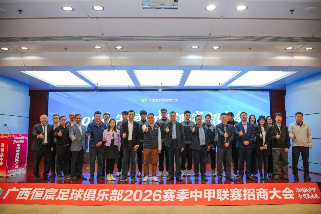 12月29日,广西恒宸足球俱乐部2026中甲联赛招商大会在广西体育中心圆满举行。自治区体育局、南宁市体育局、广西足协和南宁市各城区政府代表,广西日报、广西广播电视台等相关单位主管人员,与各界企业代表、媒体及球迷朋友们共同出席,携手开启广西职业足球与体育产业联动发展的新篇章。