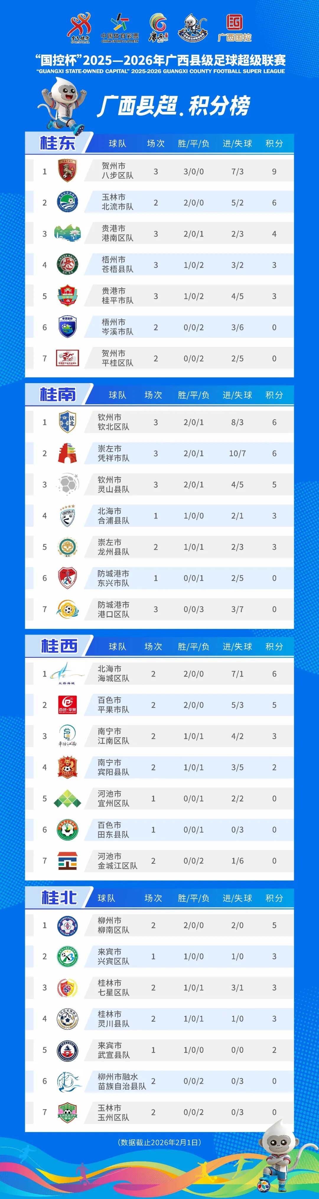 桂南赛区本轮同样看点十足。钦州市钦北区队3-1击败防城港市港口区队后,以2胜积6分的成绩登顶。崇左市凭祥市队则以一场酣畅淋漓的4-1大胜钦州市灵山县队,拿到2胜1负积6分,因为胜负关系和净胜球劣势暂列第二,钦州市灵山县队积5分排在第三,形成三足鼎立态势,后续竞争愈发激烈。