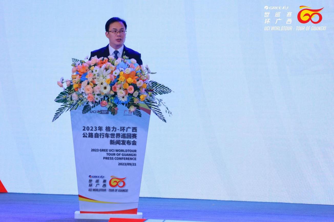 9月21日,2023年环广西公路自行车世界巡回赛(以下简称“环广西”)新闻发布会在南宁举行。中国自行车运动协会、广西壮族自治区人民政府、广西壮族自治区体育局等领导,万达文旅集团及格力电器等赞助商嘉宾出席活动。