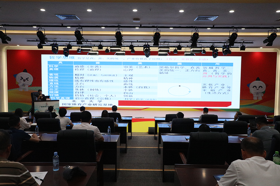8月28日晚,由自治区体育局指导、广西体育产业协会承办的广西体育产业大讲堂第一讲正式开讲,自治区体育局党组成员、副局长甘永辉出席。北京大学国家体育产业研究基地秘书长、研究员,国家体育总局-北京大学体教融合研究院执行副院长何文义作专题辅导,广西体育产业协会40多家会员企业及5所高校有关代表共70多人参加广西体育产业大讲堂。