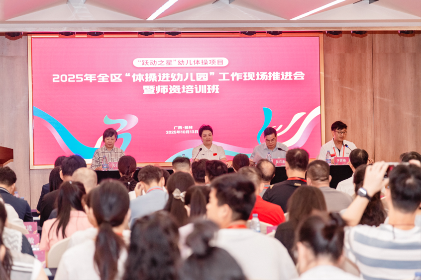 10月13日,2025年全区“体操进幼儿园”工作现场推进会在桂林市召开。自治区体育局党组成员、副局长魏鹤及广西幼儿师范高等专科学校校长侯宣杰出席会议并讲话。