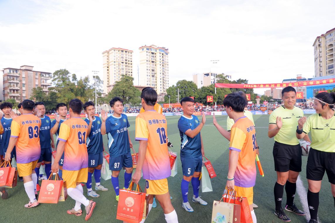 开幕式上,独具地方特色的非遗节目《狮龙麒麟迎贵宾》率先登场,以传统艺术形式表达了对远道而来的宾朋的热忱欢迎,展现了深厚的文化底蕴。四支球队依次入场展现地域风采,升国旗仪式后,两场正赛及一场青年赛相继开赛。各代表队充满地方特色的亮相方式成为亮点,贵州榕江队尽显“村超”发源地的淳朴活力,九江经开区足球队手提家乡特产欢乐入场,广西苍梧县六堡茶足球队带着地域茶韵特色亮相,东道主浦北代表队融入本土元素进行热情展示。各队赛前互赠礼品、致意问好,多元文化在球场交相辉映。