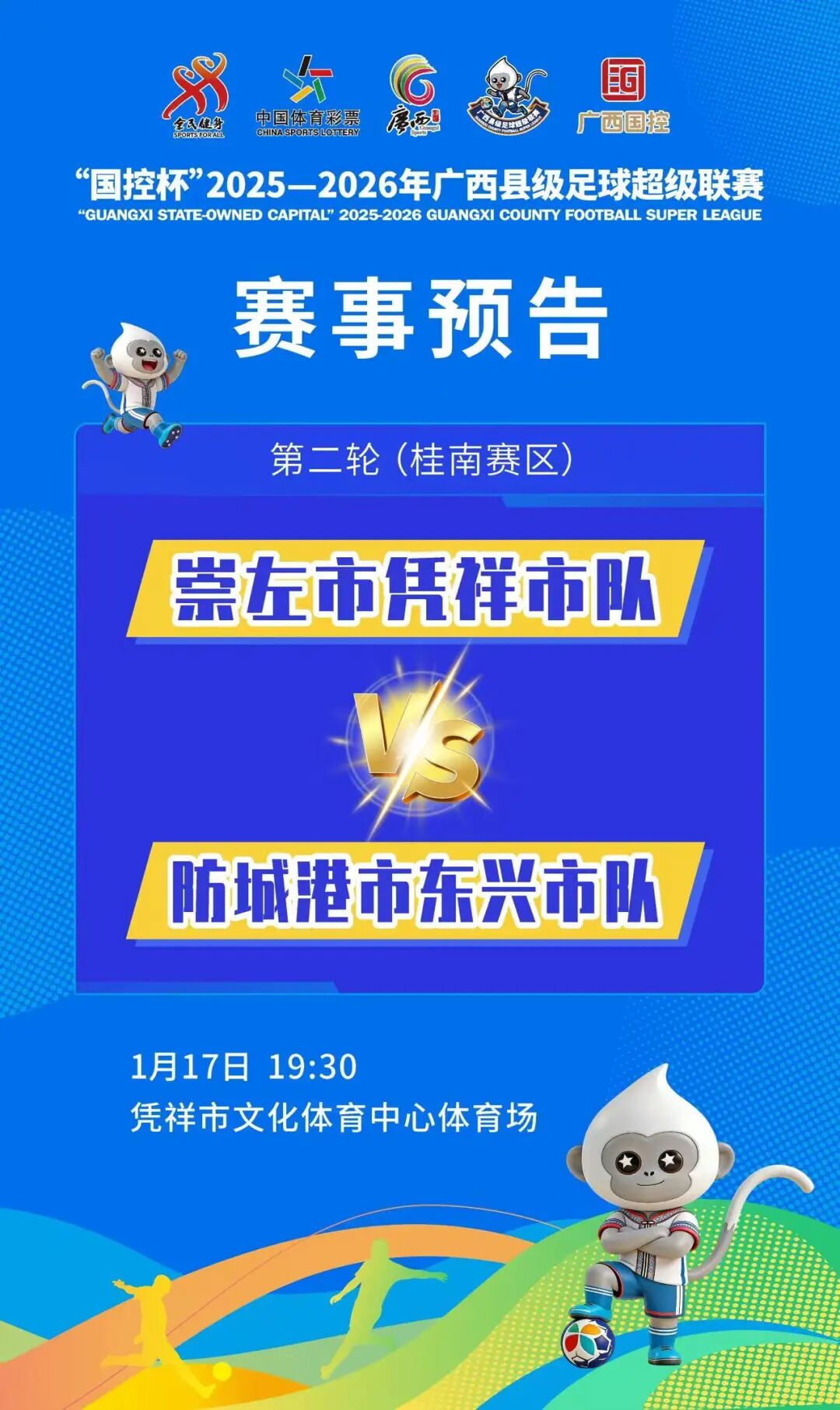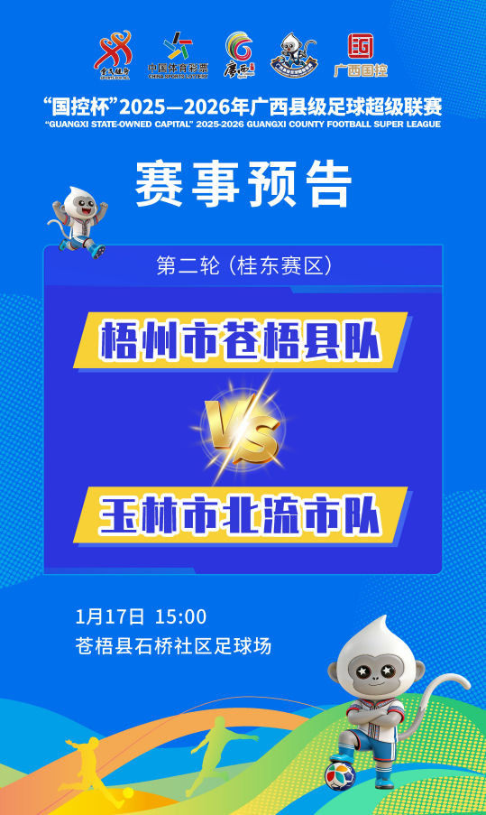 足球热浪席卷八桂!“国控杯”2025—2026年广西县级足球超级联赛(以下简称广西“县超”联赛)首轮激战余温未散,第二轮比拼已蓄势待发!1月17日至18日,桂东、桂南、桂北三大赛区将同步开球,7组对决轮番上演,用热爱与拼搏续写足球的热血篇章。这里有最纯粹的足球激情,有最浓厚的乡土情怀,更有“足球+文旅”融合的独特魅力,邀你赴一场家门口的足球盛宴!