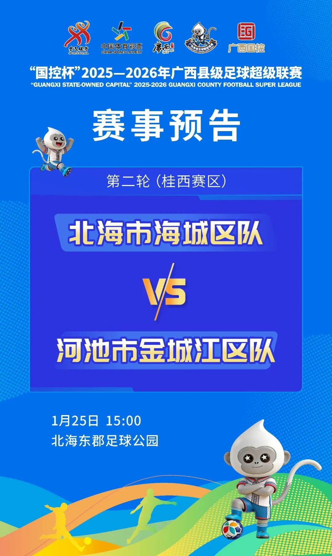 1月25日(周日)15:00在北海东郡足球公园,北海市海城区队VS河池市金城江区队,北海市海城区队作为海滨城市的代表球队,队员们兼具速度与爆发力,高位逼抢战术极具压迫感,边路快攻更是拿手好戏,主场作战渴望延续胜势。河池市金城江区队防守端密不透风,反击简洁高效,将用顽强斗志挑战主场劲旅。