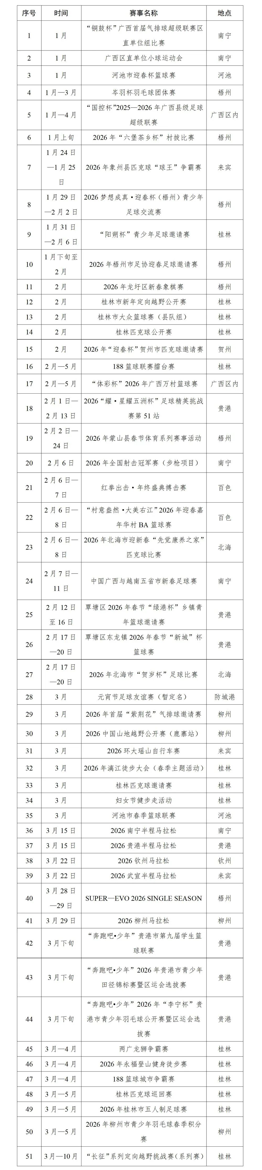 当前,“为一场赛,赴一座城”的体育旅游新风尚蔚然兴起,正成为驱动体育产业发展的重要引擎。2026年,广西将持续深入贯彻落实《国务院办公厅关于释放体育消费潜力进一步推进体育产业高质量发展的意见》(国办发〔2025〕31号)等文件要求,以“体育+”融合发展为抓手,系统谋划、统筹布局全年体育赛事活动。全区将以体育赛事为纽带,持续做深做实“赛事+”文章,提升参赛观赛体验,助推广西体育产业高质量发展。