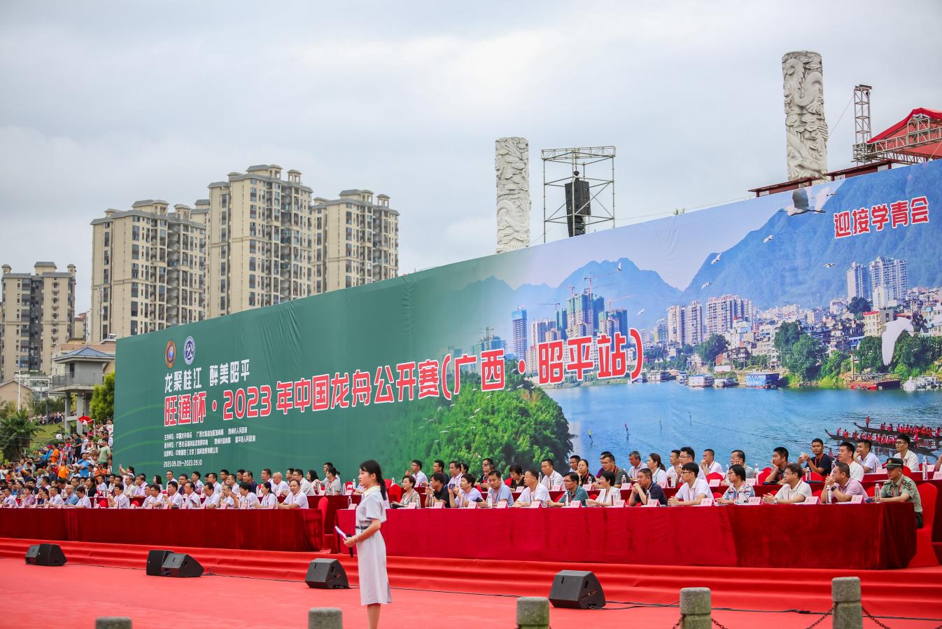 亚洲龙舟联合会主席、中国龙舟协会主席范广升,中国龙舟协会副主席沈冬生,广西壮族自治区体育局二级巡视员、竞技体育处处长杜雪峰,贺州市人大常委会副主任陈翼明,贺州市副市长陈华,贺州市政协副主席唐敬春,贺州市体育局局长叶丽燕,昭平县县长邓忠耀,昭平县人大常委会主任吴伟红,昭平县政协主席张贤才等领导出席开幕式并为龙舟披红、点睛。开幕式由叶丽燕主持,邓忠耀致欢迎辞,范广升宣布开幕,陈华鸣锣开赛。