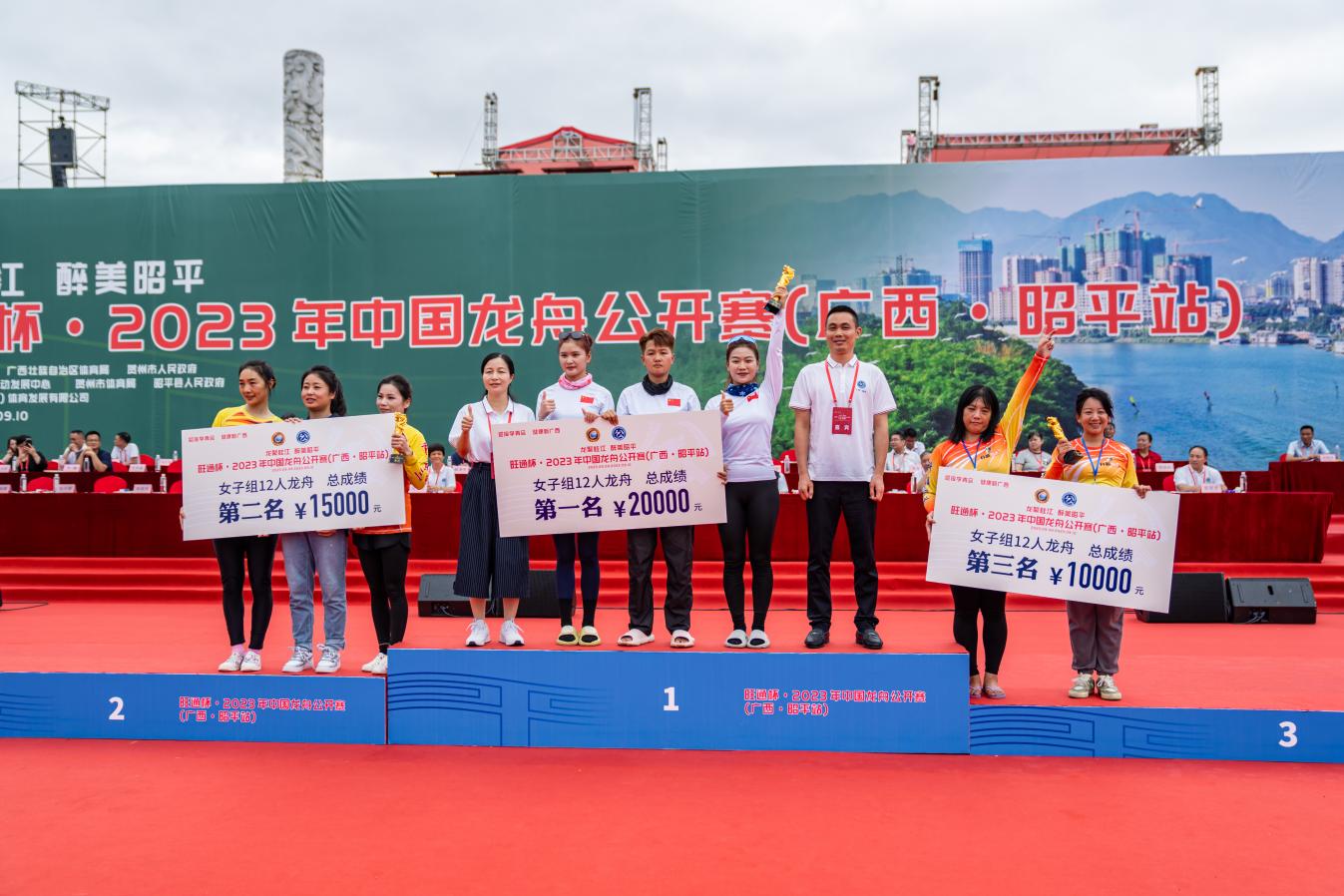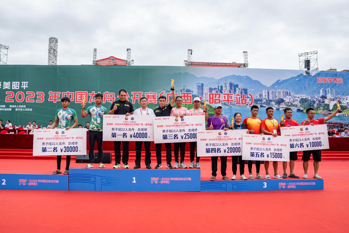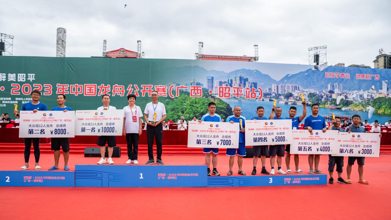 经过激烈的角逐,广东顺德乐从罗浮宫队获男子组团体总分、3000米绕标赛、100米直道赛、500米直道赛第一名;福建福州长乐汇泉获男子组200米直道赛第一名;广东东莞万江南方科技获女子组团体总分、100米直道赛第一名;广西昭平县龙舟队获女子组200米直道赛第一名;重庆合川龙舟队获女子组500米直道赛第一名;昭平政法线队获大众组团体总分、100米直道赛、500米直道赛第一名。