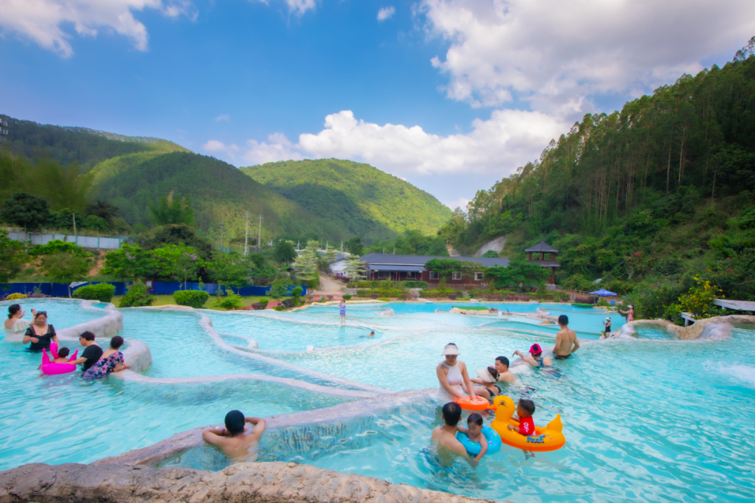 十万大山布透温泉位于防城港市上思县,景区三面环山,地下温泉资源丰富,是国内目前首家可饮可浴的矿泉水温泉,自涌自喷,日出水量达12000吨左右。景区建有类型多样的温泉池房车营地、温泉民宿,还有大面积的热带水果采摘园。特别是景区的叠水池依山而建,呈梯田状排列,层层叠叠,水池的碳酸钙华沉呈现出色彩斑斓的景观,有“小黄龙”之美誉,是远近闻名的网红打卡点温泉天然恒温,一年四季可游可泡,是一处不可多得的保健养生型温泉。