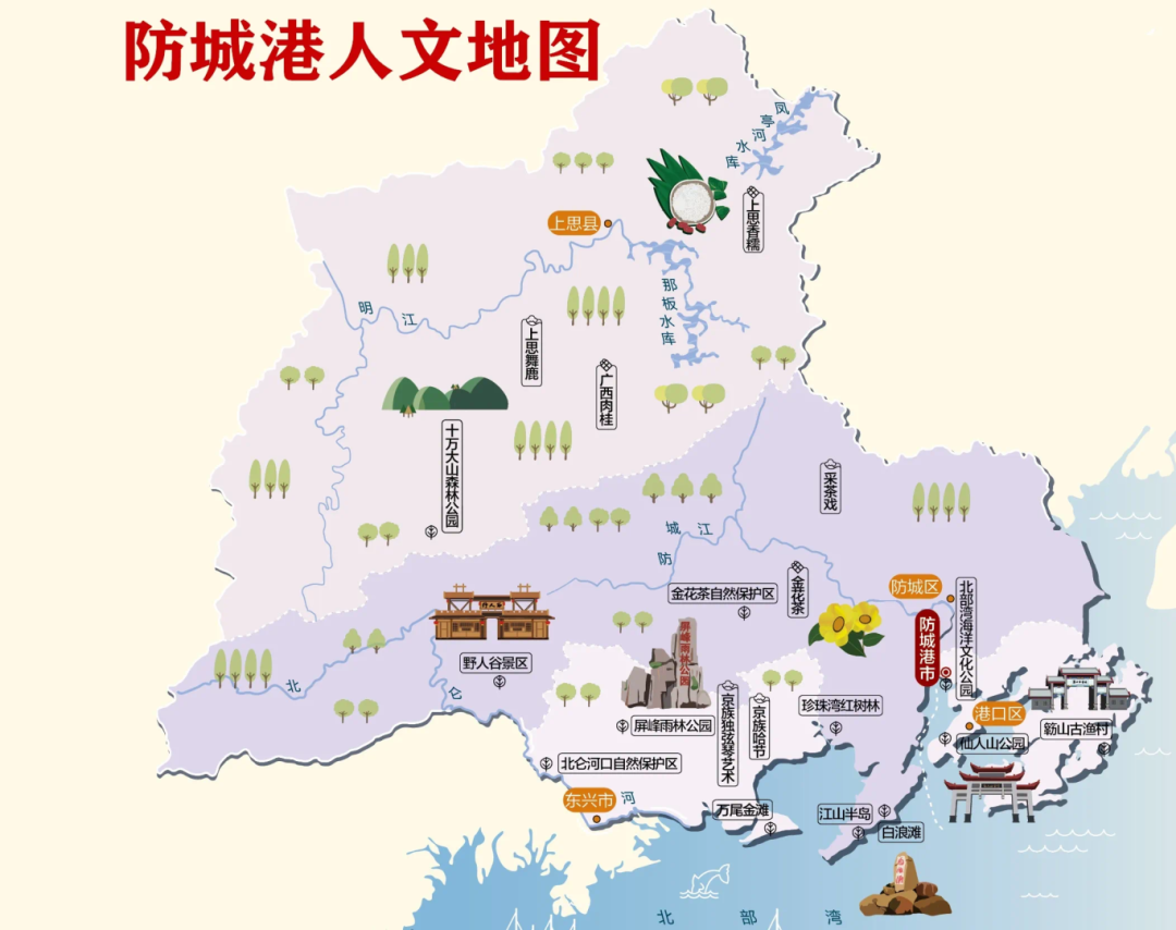 防城港市拥有丰富的“海、边、山”旅游资源,滨海度假旅游、中越跨国旅游、森林温泉康养旅游等独具魅力,“上山下海出国”特色游格局独树一帜。防城港市不仅是盛名在外的“中国氧都”“中国金花茶之乡”“中国白鹭之乡”,同时也被誉为“中国长寿之乡”,是一座“城在海中、海在城中、人在景中”的全海景生态海湾城市、边关城市、旅游城市。