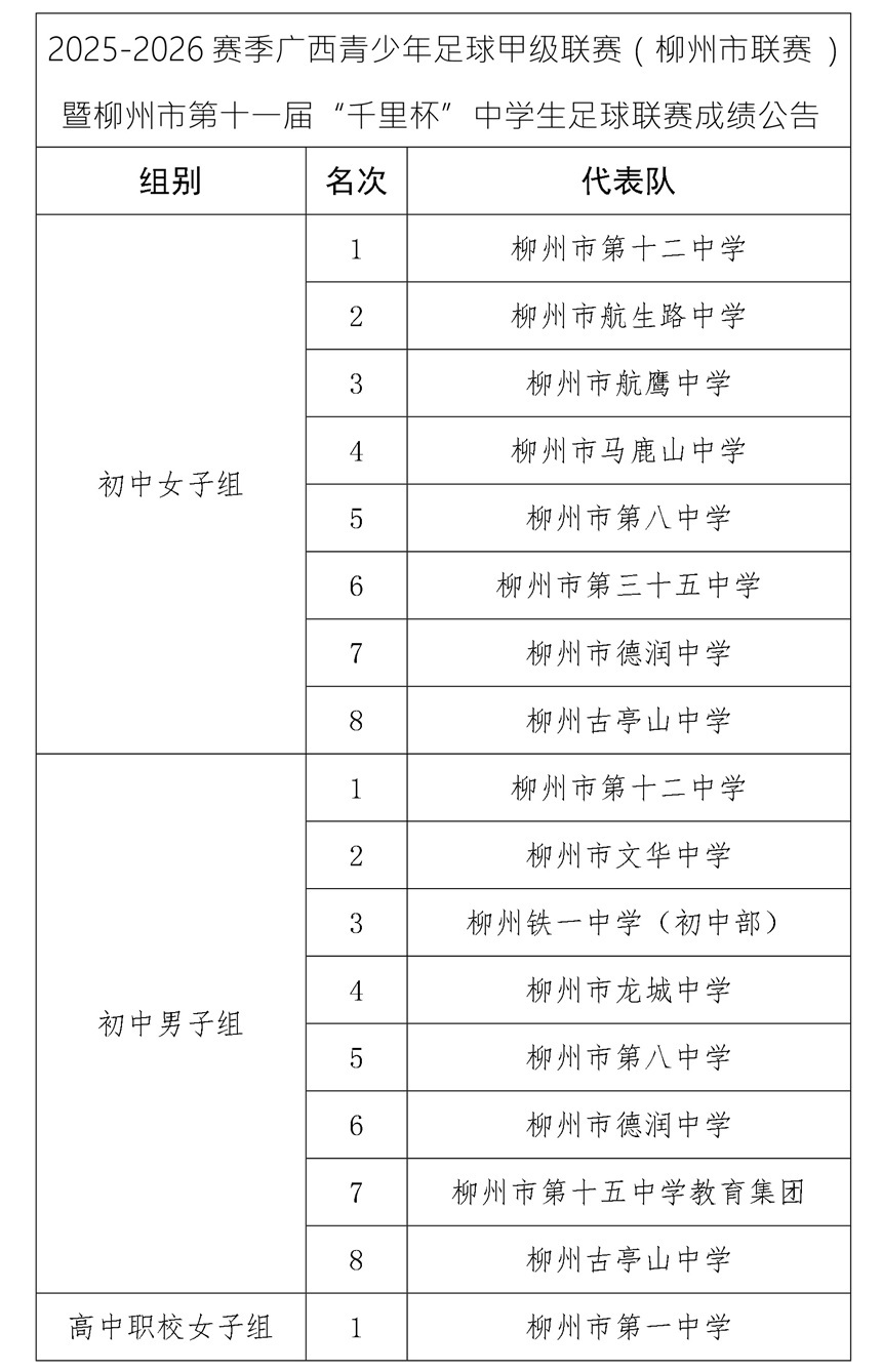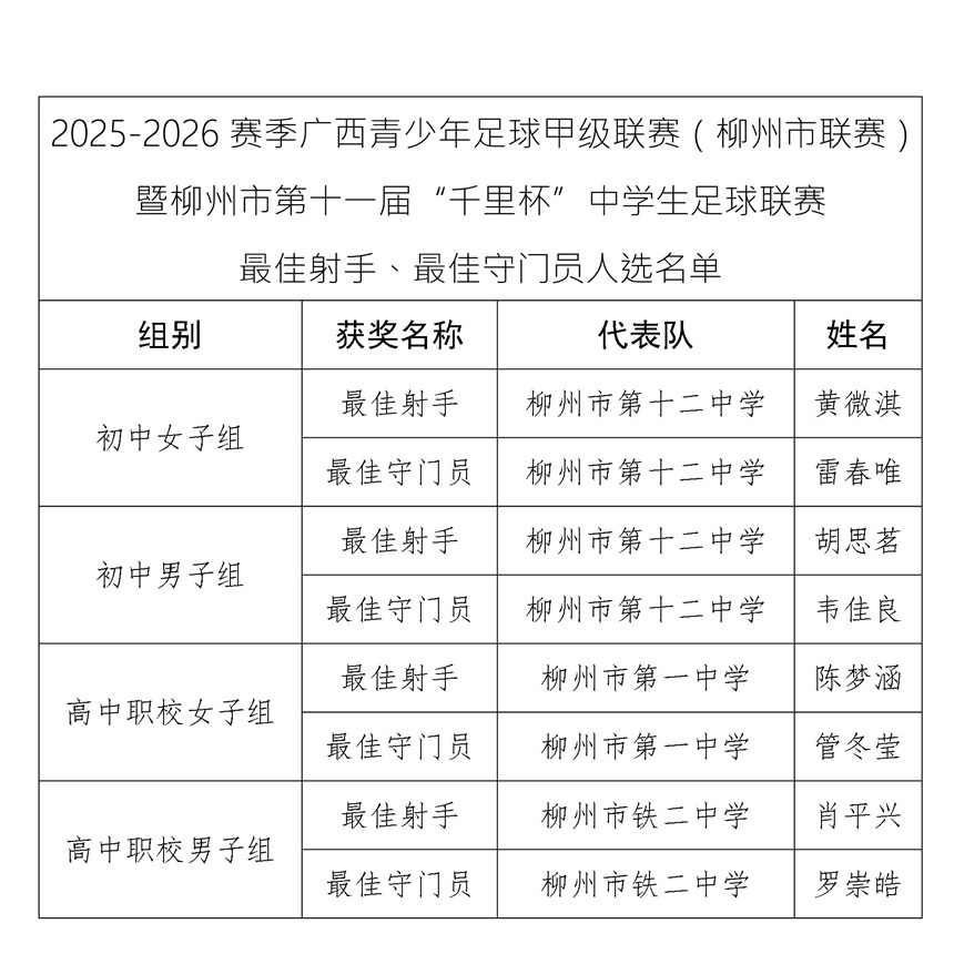 2025-2026赛季广西青少年足球甲级联赛由自治区体育局、自治区教育厅联合主办,联赛实行自治区总决赛(赛会制)+设区市联赛(主客场制)赛制体系。本次获得柳州市初中组和高中男子组冠军的队伍将代表柳州市出战自治区总决赛,期待他们在总决赛中能够继续凭借出色的表现,顽强拼搏的精神和默契的团队配合,一展柳州体育精神,再获佳绩。
