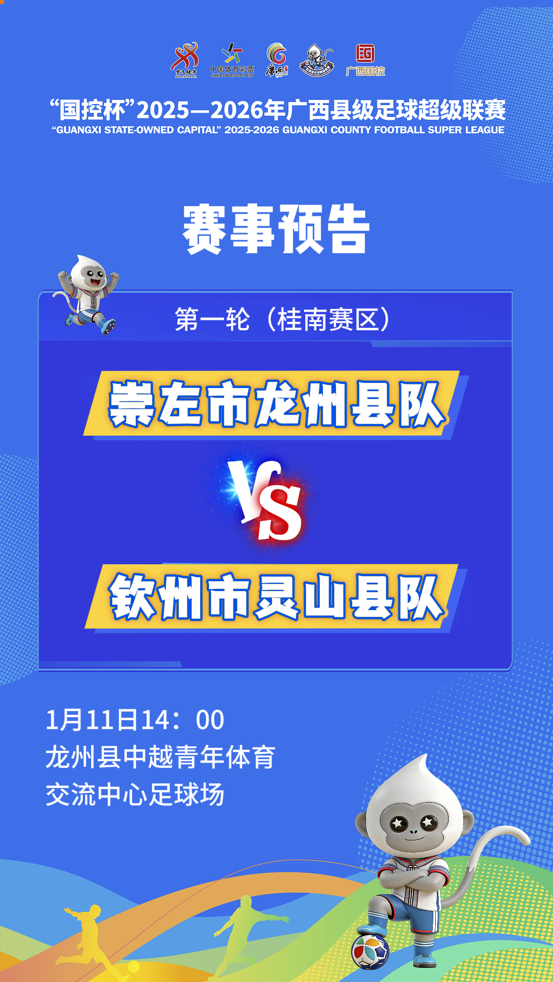1月11日14时,崇左市龙州县队与钦州市灵山县队的对决将在龙州县中越青年体育交流中心足球场上演。比赛将汇聚民族文化元素,展示边关足球的热血与跨境风情的魅力。