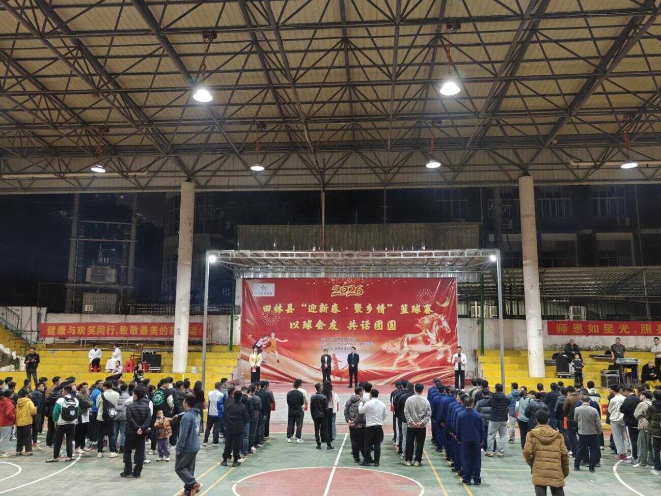 金蛇辞旧,骏马迎春。1月18日晚,在喜气洋洋、阖家团圆的腊月时节,田林县2026年“迎新春·聚乡情”新春篮球赛在田林县灯光球场盛大开幕。时隔两年,田林县再次举办迎新春篮球赛。这一场融合了体育激情与新春喜庆的篮球盛宴正式拉开帷幕,为即将到来的农历新年增添了昂扬奋进的活力色彩。