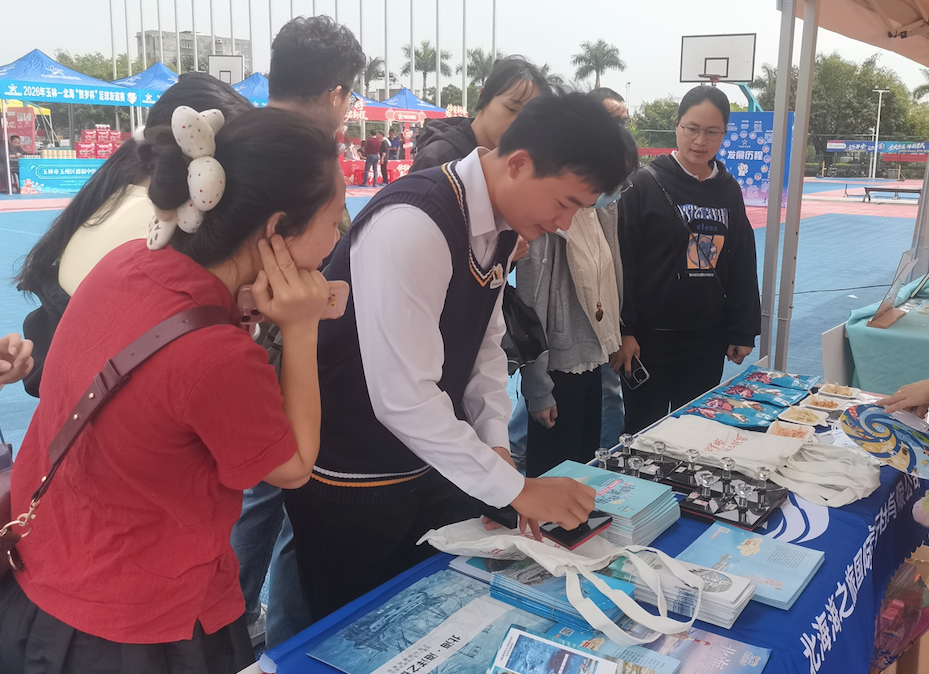 此次“贺岁杯”不仅是绿茵场上的竞技,更是两地文体旅深度融合的生动实践。赛场周边同步设立的文旅推介活动现场人头攒动,北海市组织了海之旅旅行社、北海新绎、“北海有礼”等文旅企业参展推介,通过发放资料、现场讲解、文创展示等形式,向玉林市民及现场观众生动展现了北海滨海风情的独特魅力。从银滩的碧波细沙到涠洲岛的火山奇观,从百年老街的历史底蕴到地道的海鲜美食,一系列精品旅游线路和特色产品吸引了众多目光,现场工作人员热情邀请玉林朋友前往北海旅游观光、休闲度假。