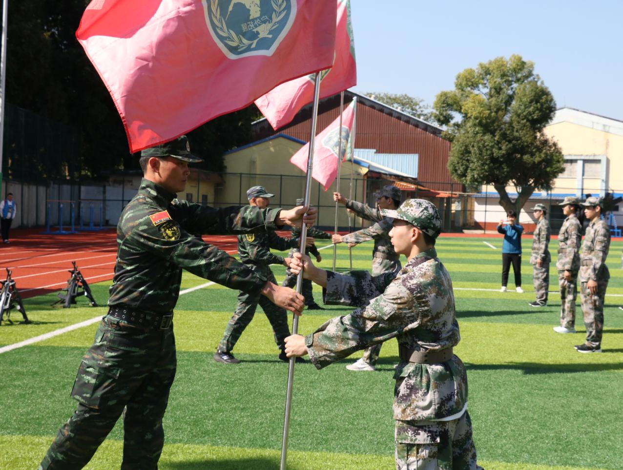 随后,运动员代表杨洁霞进行表决心发言,表示一定要以积极的态度、昂扬的精神面貌参加军训,严格要求自己,克服困难,努力培养吃苦耐劳的意志品质,做一个有体魄、能拼搏、有知识、能创新,遵守铁的纪律,养成良好的行为、生活习惯的新时代运动员。在接下来的授旗仪式上,旗手们从教官手中接过了连旗,运动员们在激昂、嘹亮的军歌声中开始了为期五天的军训生活。