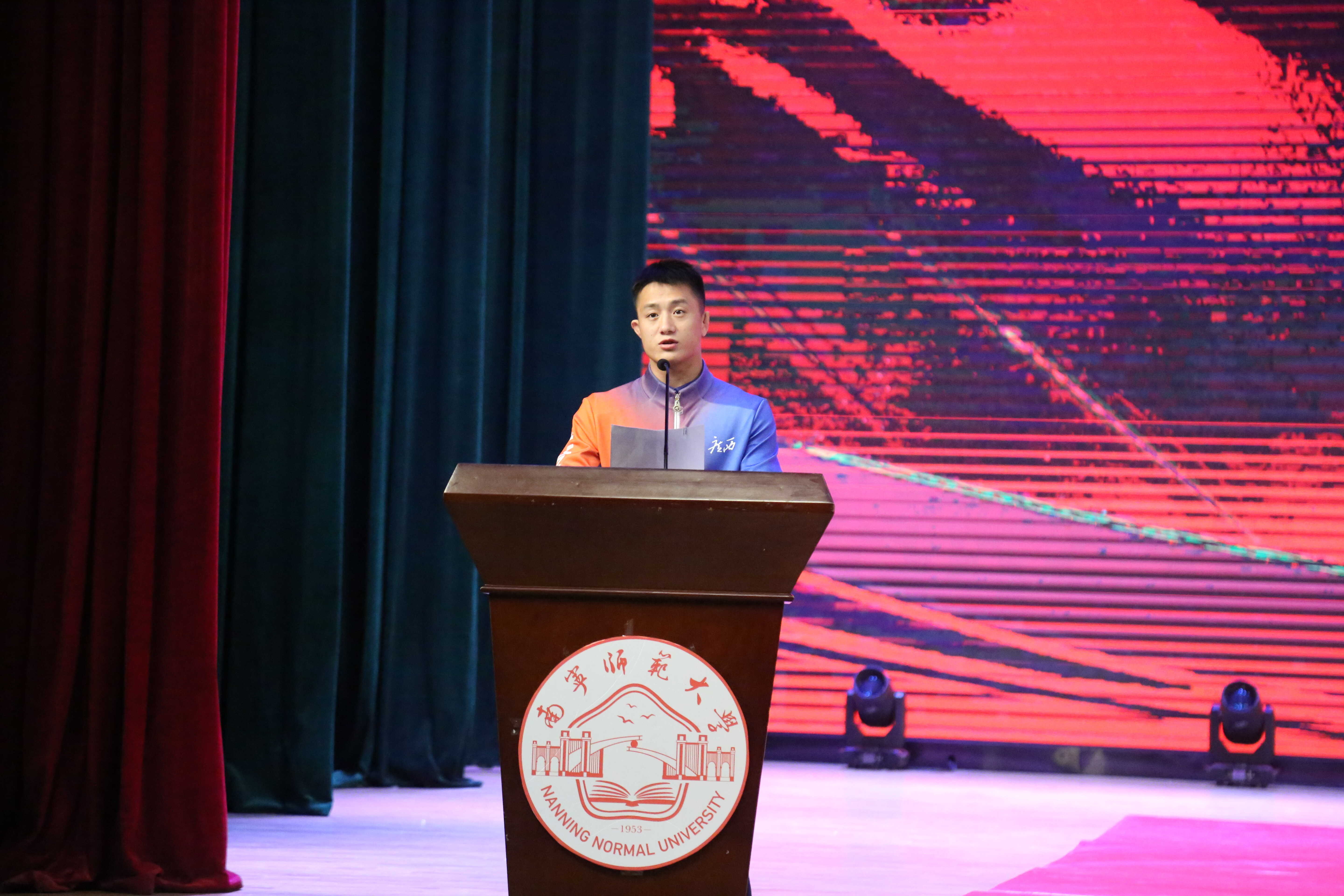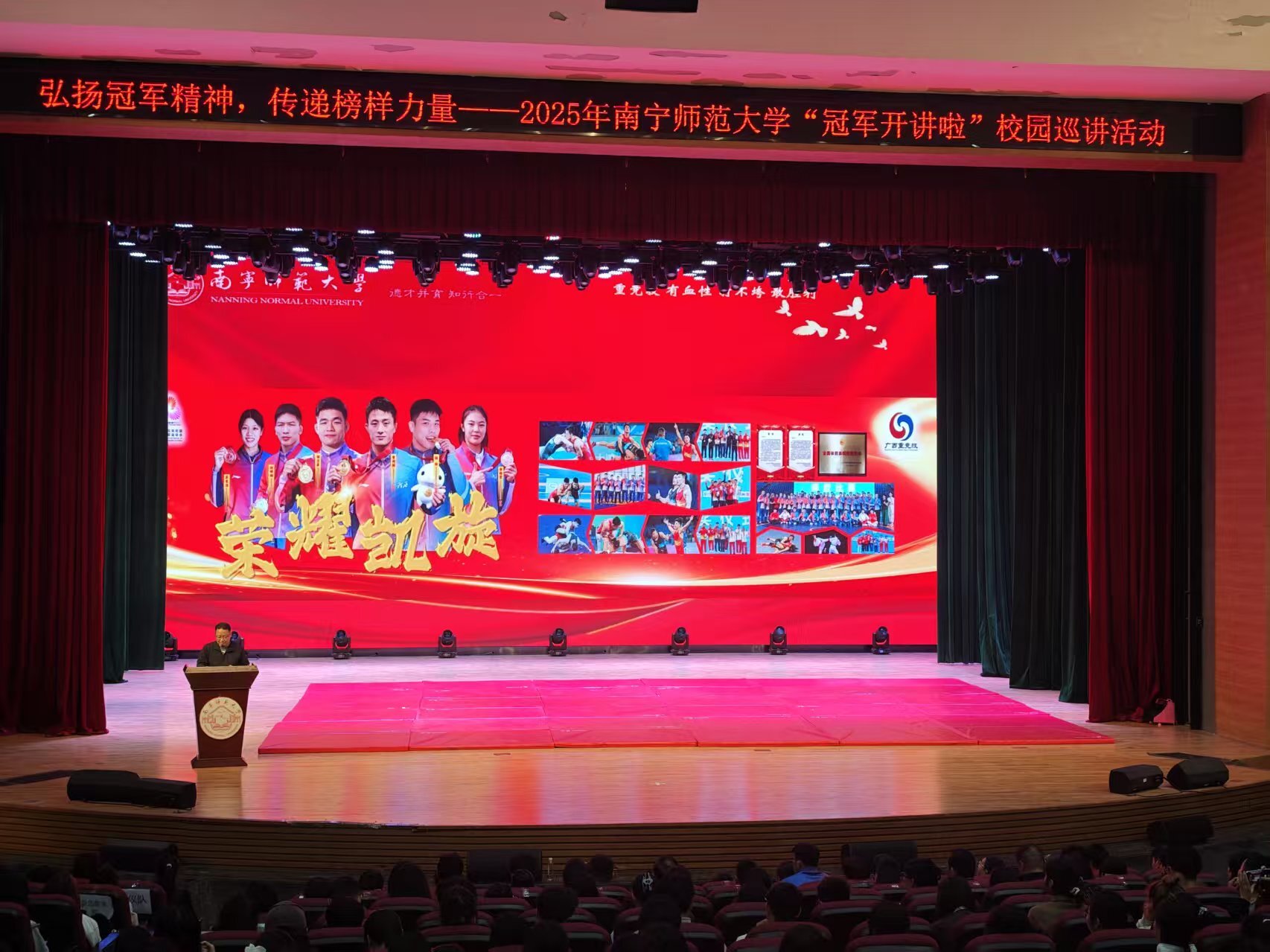 为深入弘扬中华体育精神,发挥体育冠军的榜样引领作用,11月29日,南宁师范大学与广西重竞技运动发展中心共同举办“冠军开讲啦”校园巡讲活动。广西重竞技运动发展中心副主任、广西摔跤总教练李征宇及副主任梁立昌带着曹利国、邹万豪、陆锋等3名全运会金牌运动员、教练员以及一批全国冠军运动员走进武鸣校区,与近千名师生面对面分享拼搏故事,传递奋进力量。活动由南宁师范大学体育与健康学院院长赵芳主持,体育与健康学院全体师生以及各学院学生代表近千人参加。