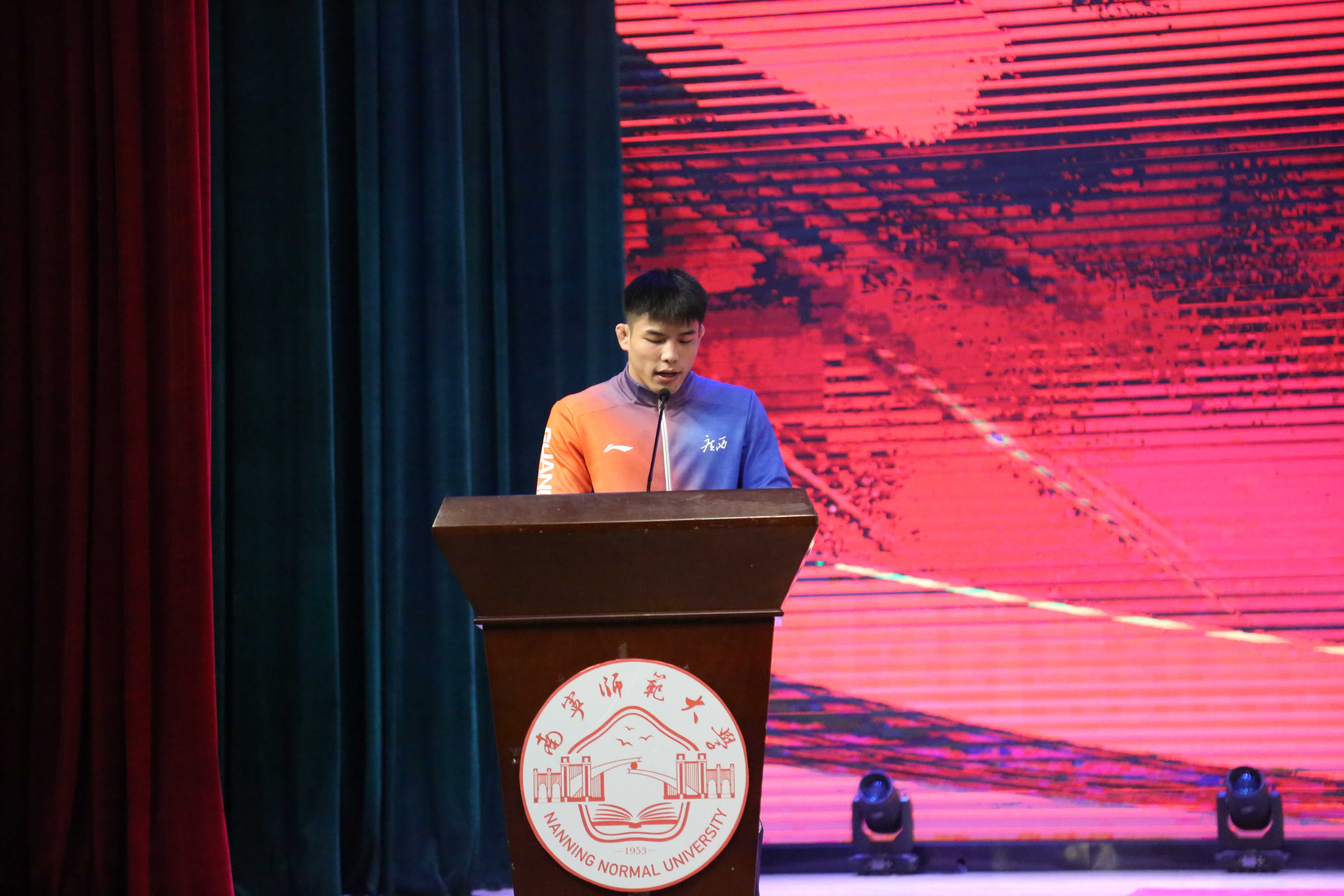 全运会冠军邹万豪则认真诠释了刻在广西运动员骨子里的“狼兵精神”,从体校初训到全运会夺冠,他用“日复一日的坚持、敢拼敢闯的努力”讲述了“冠军不是天赋的专属,而是坚持与血性的结晶”,让现场师生深切感受到“吃苦敢拼有血性,团结奉献严自律”的体育底色。