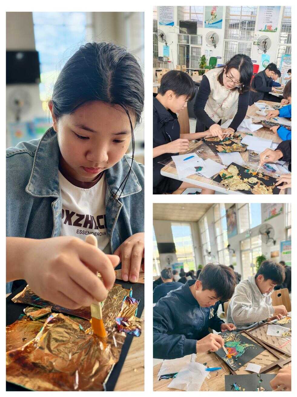运动员们在老师的指导下认真制作非遗金箔画