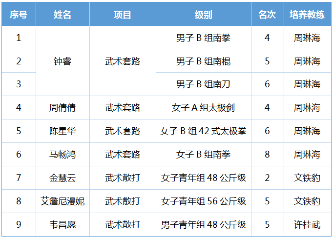 散打项目赛场上,散打队在教练许桂武、文铁豹的联合带领下,8名运动员奋勇争先。其中,金慧云在女子青年组48公斤级赛事中一路过关斩将,凭借强劲的实力荣获第二名;艾詹尼漫妮在女子青年组56公斤级较量中表现出色,获得第五名;韦昌愿则在男子青年组赛事中顽强拼搏,同样斩获第五名。
