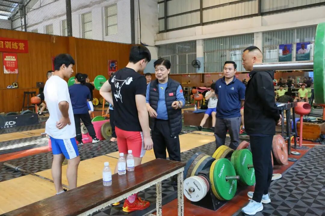 广西首枚奥运举重金牌获得者吴数德(右三)现场指导训练