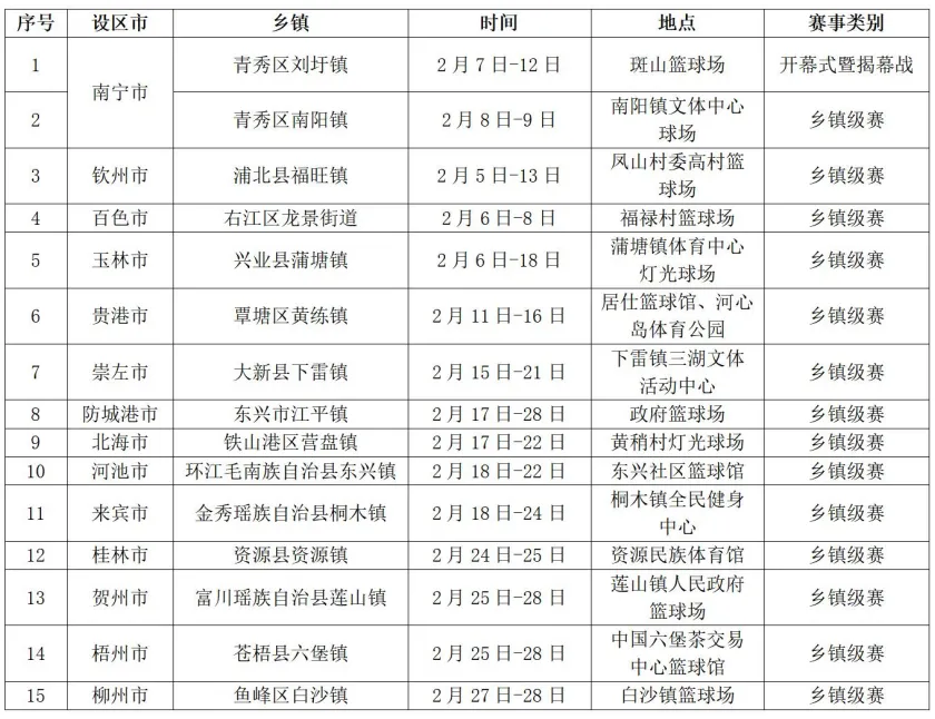 本届赛事从2月至3月,在全区14个设区市、各县(市、区)及乡镇开展,集结全区篮球强队同台竞技,呈现巅峰对决,让篮球激情遍布八桂乡村,为新春添足体育年味,为全民健身注入强劲活力。