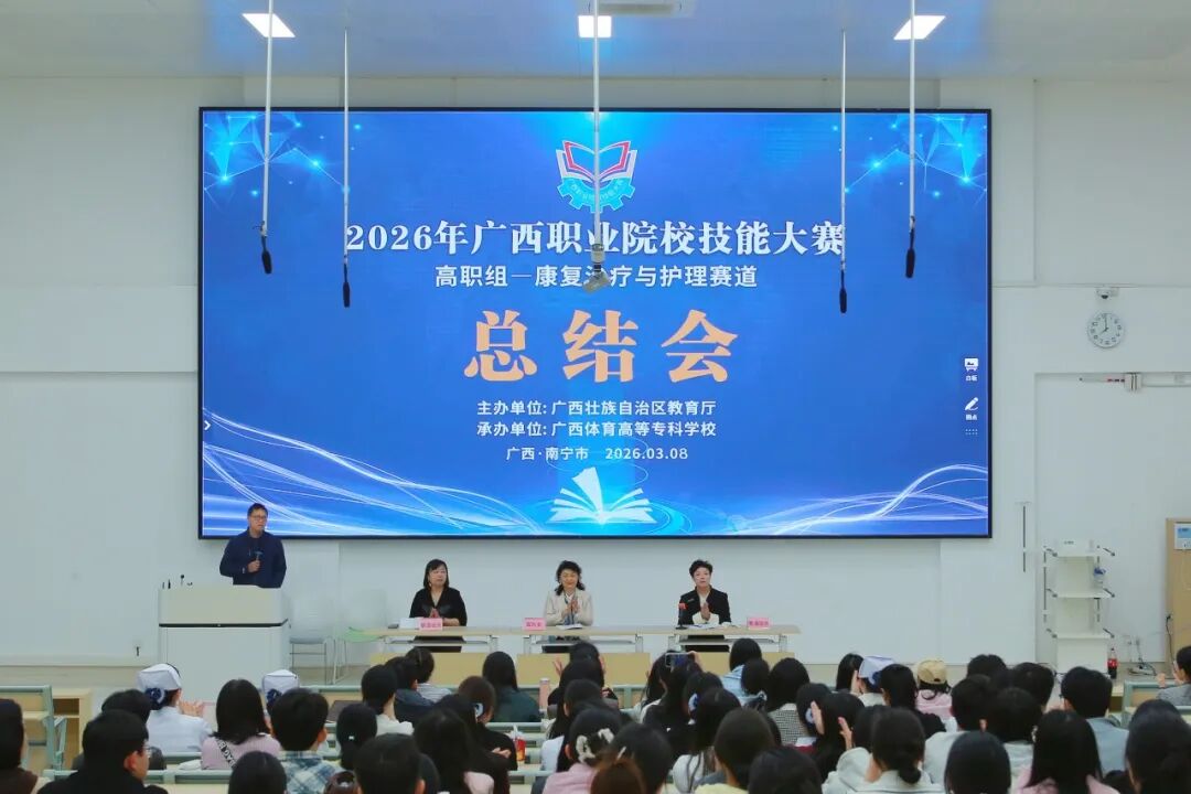 3月6日—8日,由自治区教育厅主办、广西体专承办的2026年广西职业院校技能大赛高职组康复治疗与护理赛道比赛在相思湖校区成功举办。来自全区10所高职院校的18支代表队71名选手齐聚体卫融合中心,同台竞技,尽显风采。