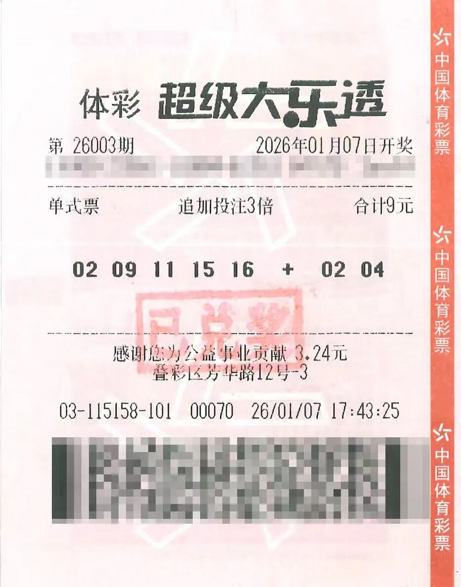 1月7日,超级大乐透第26003期开奖。前区开出号码02、09、11、15、16;后区开出号码02、04,全国共开出7注一等奖。广西桂林中出3注追加一等奖,单票奖金达4822万元,刷新广西体彩最高奖金纪录。